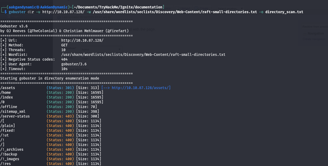 gobuster dir -u http://10.10.87.128/ -w /usr/share/wordlists/seclists/Discovery/Web-Content/raft-small-directories.txt -o directory_scan.txt