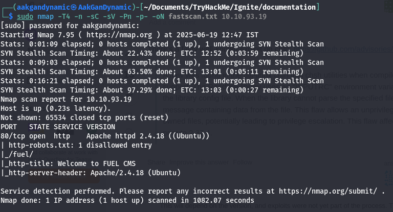 sudo nmap -T4 -n -sC -sV -Pn -p- -oN networkScan.txt 10.10.242.113