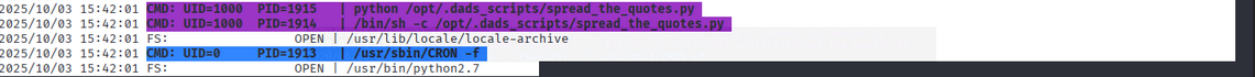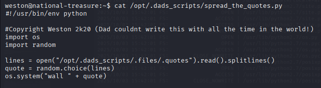 Listing /opt/.dads_scripts revealed a .files directory containing .quotes. The .quotes file is read by the periodic script.