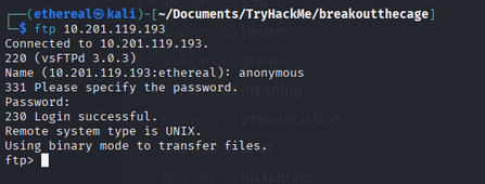 Walkthrough of Break out the cage: web and service enumeration (HTTP, FTP), content discovery and decoding, gaining initial access via a writable cron‑read file, local enumeration and shell stabilization, and privilege escalation via a misused SUID/Polkit helper.