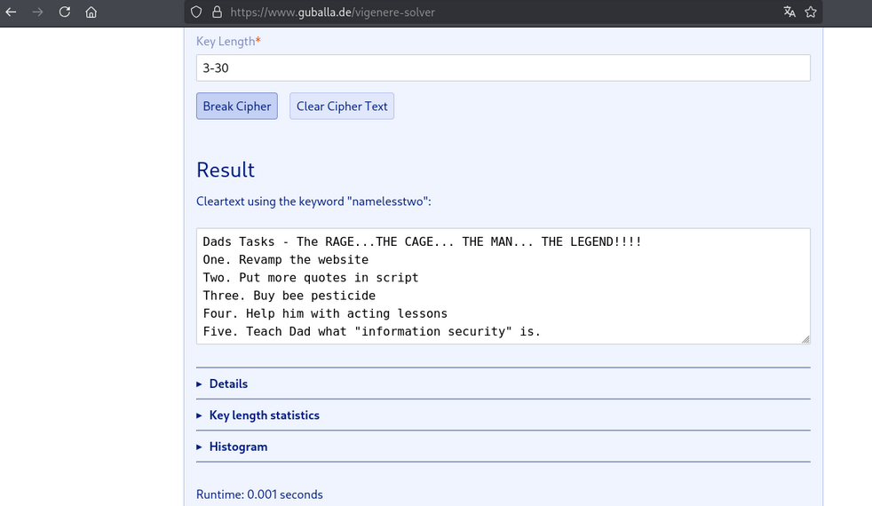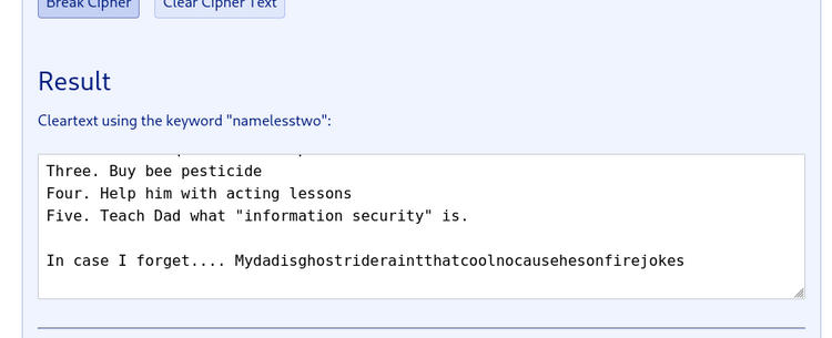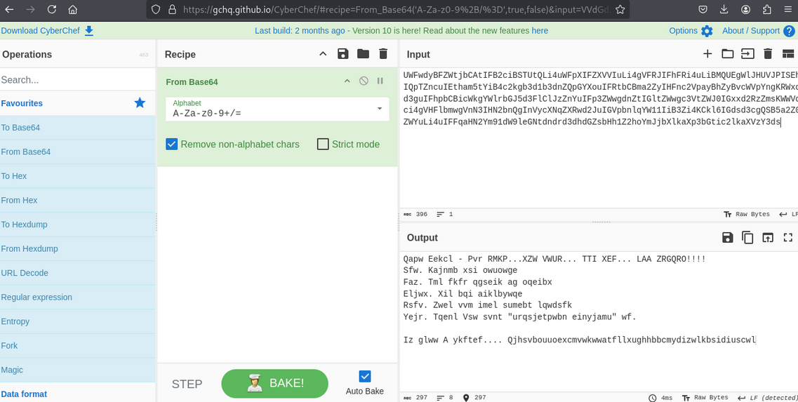 A Base64 string recovered from the lab decoded to a Vigenère‑encrypted message. I decoded the Base64 (e.g., with CyberChef) and solved the Vigenère cipher using the Guballa Vigenère Solver open it in a new tab: Guballa Vigenère Solver.