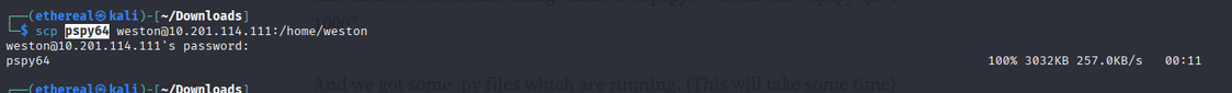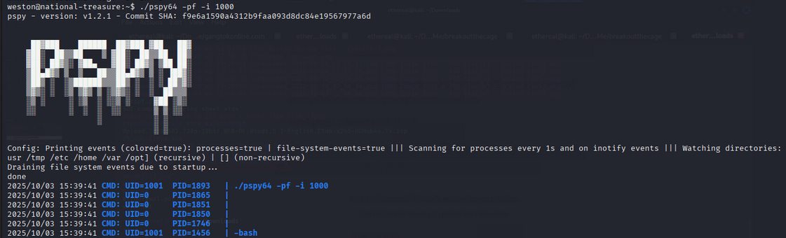 To inspect scheduled activity, I used pspy on the box (copied to the target and made executable). pspy showed a cron-invoked Python script: