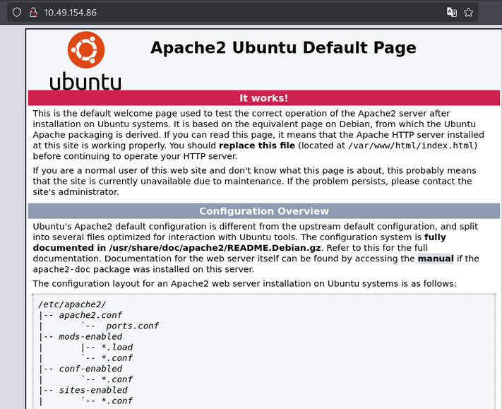 Accessing the web application on port 80, we see a simple page with the title “Apache2 Ubuntu Default Page: It works”