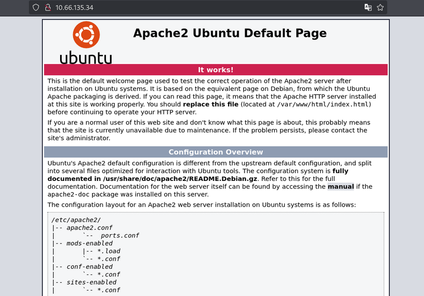 Accessing the web application on port 80, we see a simple page with the title “Apache2 Ubuntu.