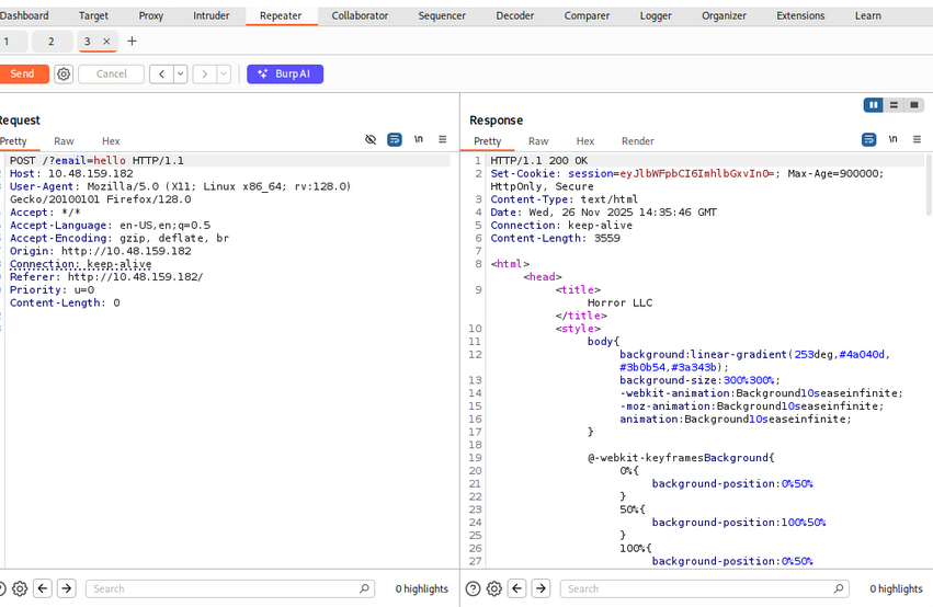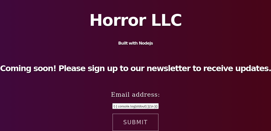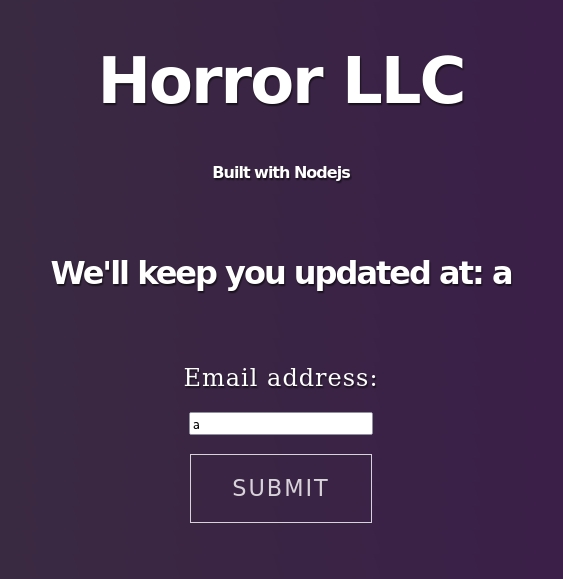 Accessing the web server on port 80 reveals a simple website for “Horror LLC”. The homepage contains input fields that may be vulnerable to deserialization attacks.
