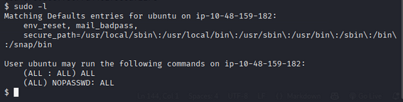 we saw user ubuntu have all sudo privileges without password, but can accessing root directly is not possible due to restricted shell.