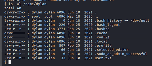 we saw there is two users in the home directory dylan and ubuntu navigating to dylan’s home directory we found user.txt file