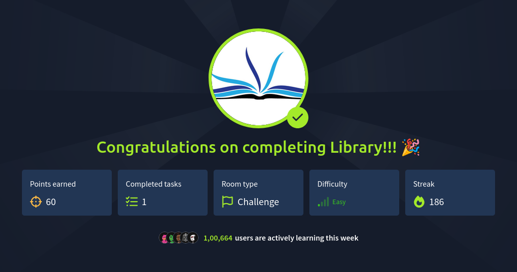 Welcome to the Library! This beginner-friendly boot2root machine was created for FIT and BSides Guatemala CTF. The challenge tests your skills in reconnaissance, credential brute-forcing, and Linux privilege escalation.