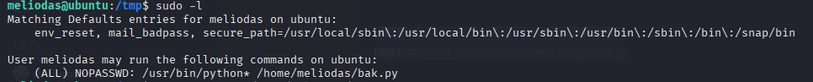 Bingo! The output shows that meliodas can run a Python script as root without a password: