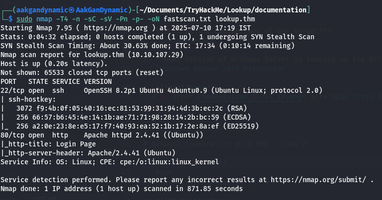 sudo nmap -T4 -n -sC -sV -Pn -p- -oN fastscan.txt lookup.thm