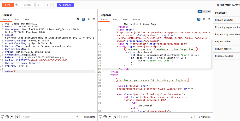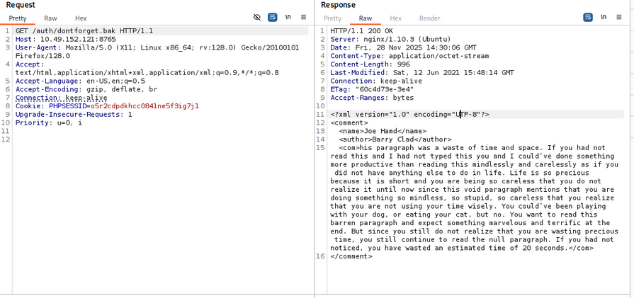 now let’s check the /auth/dontforget.bak file, using Brup Suite.