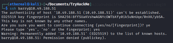 we have barry user ssh key, let’s check the ssh with our past credentials. we saw, we cant login using password authentication. So we need to use the ssh key to login.