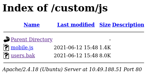 Now let’s visit the custom directory found earlier: http://10.49.188.51/custom/. Here, we find the two folders css and js. but in js folder, we find a file named users.bak.