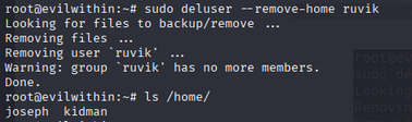 Just run this command: sudo deluser –remove-home ruvik This will remove the ruvik user and delete its home directory.