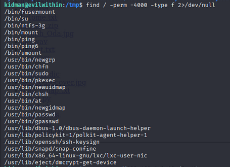 command: find / -perm -4000 -type f 2>/dev/null