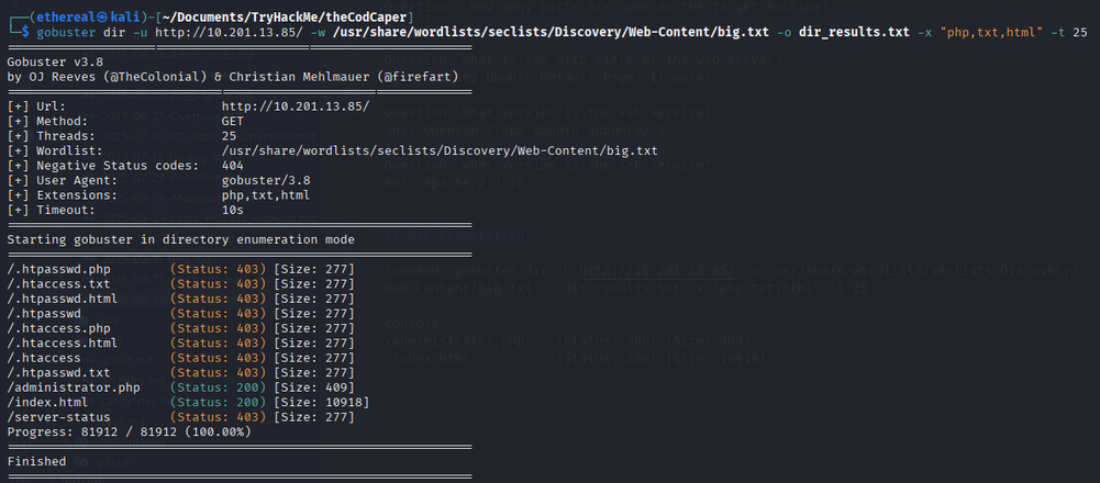 gobuster dir -u http://10.201.13.85/ -w /usr/share/wordlists/seclists/Discovery/Web-Content/big.txt -o dir_results.txt -x "php,txt,html" -t 25