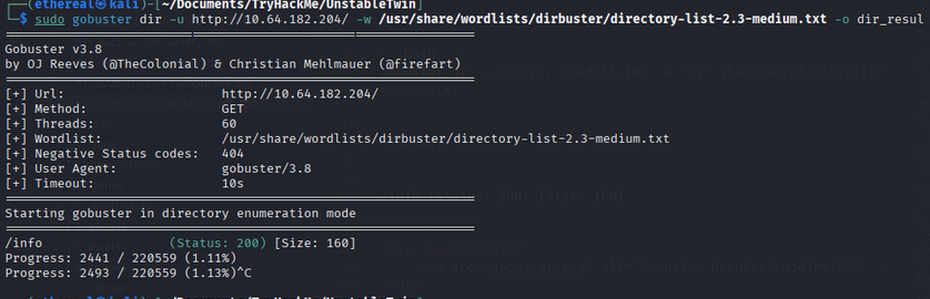sudo gobuster dir -u http://10.64.182.204/ -w /usr/share/wordlists/dirbuster/directory-list-2.3-medium.txt -o dir_results.txt -t 60